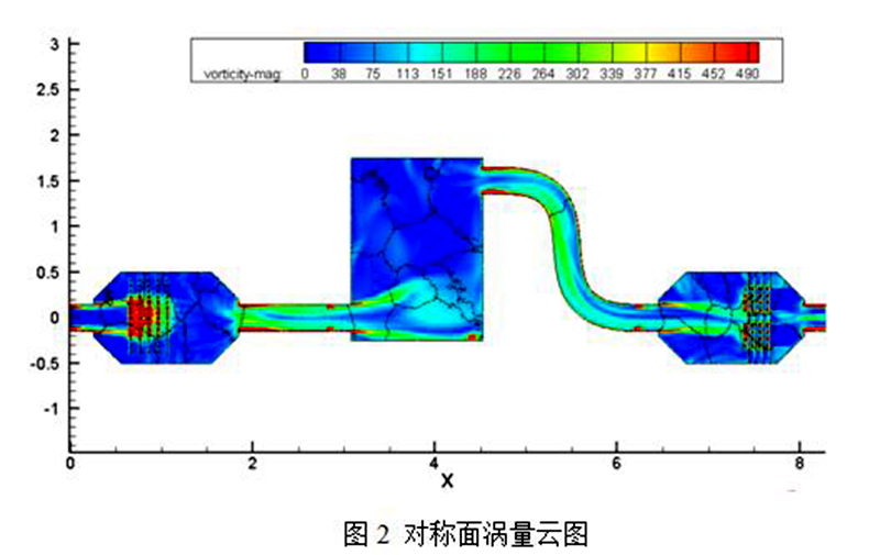 圖2為加入光催化材料后,光催化模塊在入口流量5000m3/h、150°C時(shí)的動(dòng)力學(xué)模擬結(jié)果,通過速度、渦流等流場(chǎng)特性,證明在第一排光催化材料前形成了較為均勻的速度場(chǎng)和密度場(chǎng),氣流穿過第一排光觸媒網(wǎng)后均勻向后流動(dòng)。