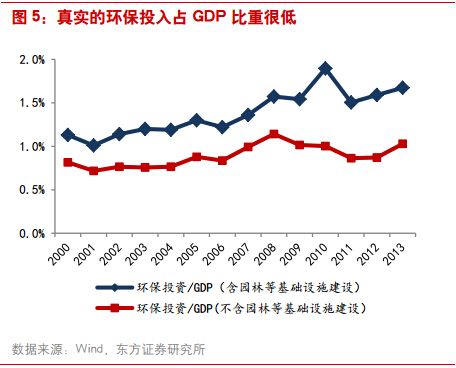 1.高估了的環(huán)保投資,行業(yè)規(guī)模仍較小 對于環(huán)保產(chǎn)業(yè),投資者一直存在一個(gè)疑問:官方口徑的投資力度很大,但從企業(yè)端看,規(guī)模卻很小,業(yè)績平淡。本質(zhì)上原因是我們的環(huán)保投入統(tǒng)計(jì)口徑問題,實(shí)際投入確實(shí)很小。按照世界慣例,環(huán)保投入需占當(dāng)?shù)谿DP的2-3%,方能保障環(huán)境污染不再加劇,而之前20多年我們的環(huán)保投入長期保持在1%以下。剔除園林投入后,“十二五”的年環(huán)境治理投入僅在4000-5000億元。