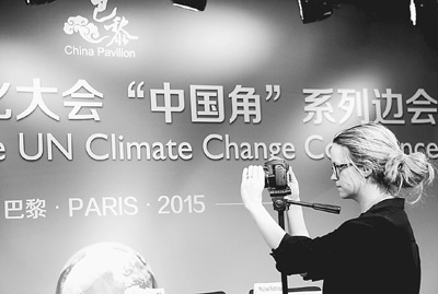 氣候變化巴黎大會期間,各國媒體紛紛聚焦中國角系列活動。圖為一名記者在中國角活動現(xiàn)場拍攝。