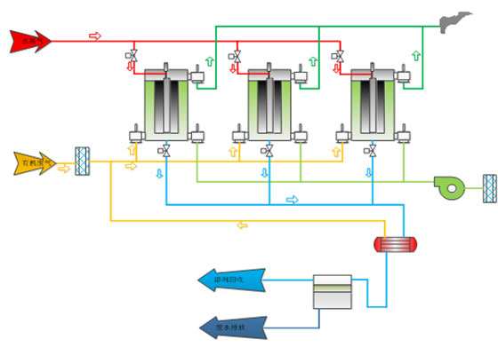 ??????? 由于從車間排放的有機廢氣是經(jīng)過渦輪膨脹機組排出,所以排出的廢氣首先經(jīng)過粗效過濾器過濾廢氣中的粉塵或雜質(zhì),然后直接進入到活性炭纖維吸附裝置進行有機廢氣吸附,經(jīng)過吸附后的廢氣可以直接達標排放;吸附飽和后的活性炭纖維經(jīng)水蒸氣脫附并且冷凝后,回收的有機溶劑可以循環(huán)再利用,廢水則進行集中處理后排放。